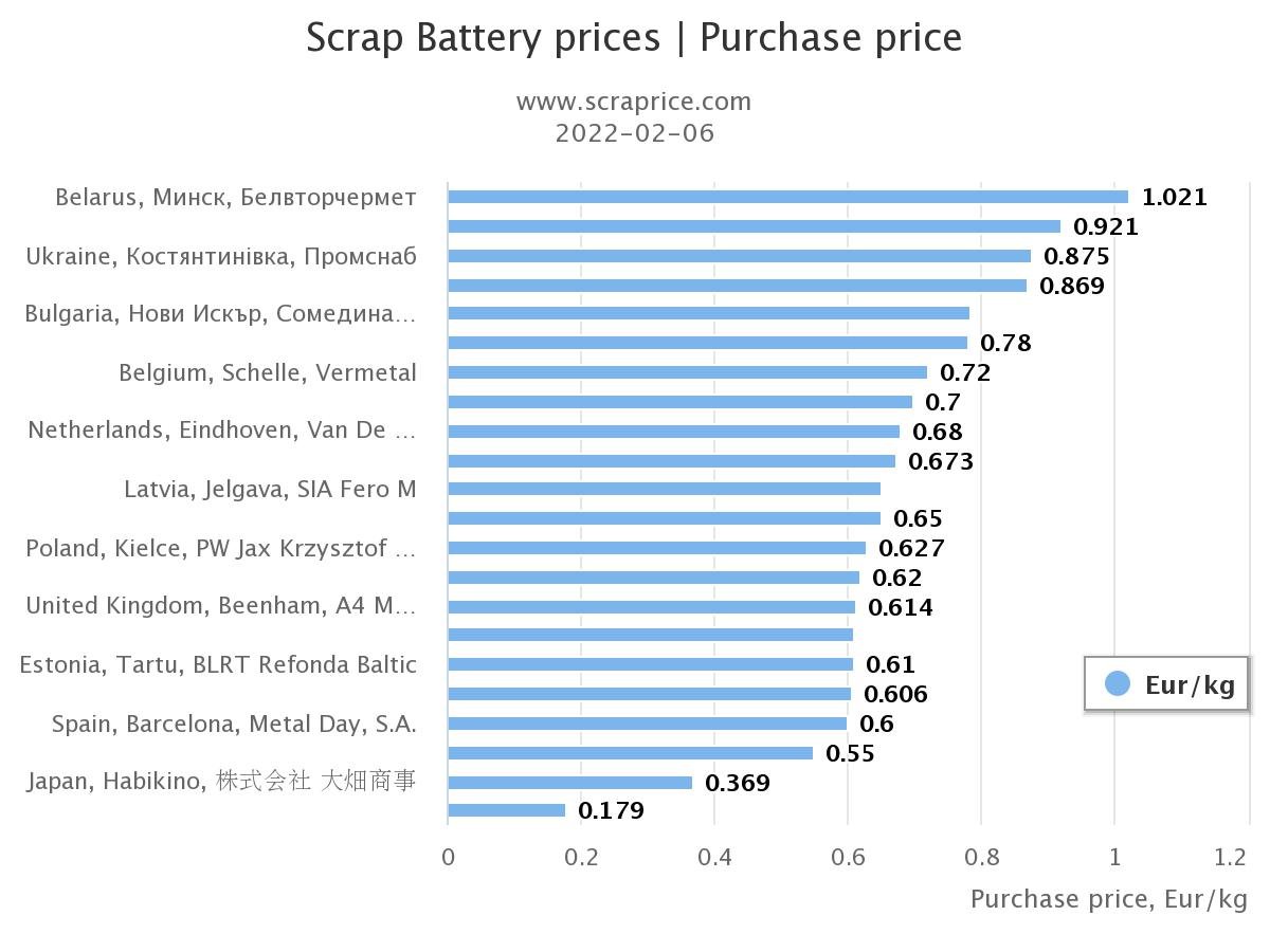 Mažėjant švino kainai aukumuliatorių laužo kaina taip pat gali mažėti. 2022 metų sausio pradžioje švino kaina metalų biržose buvo apie 2300 $ už toną, o vasario 04 dieną kaina jau buvo 3-4% mažesnė ir buvo apie 2220 $ už toną. Kadangi švino akumuliatorių laužo supirkimo kaina daugiausiai priklauso nuo švino kainos tikėtina, kad akumuliatorių laužo kaina taip pat mažės. Pagal internetinės svetainės scraprice.com informaciją didžiausios švino akumuliatorių laužo supirkimo kainos buvo Baltarusijoje. Šių metų sausio 04 dieną akumuliatorių laužo kaina Baltarusijoje siekė 1,02 € už kliogramą. Kita šalis kurioje akumuliatorių laužą galima parduoti už didelę kainą yra